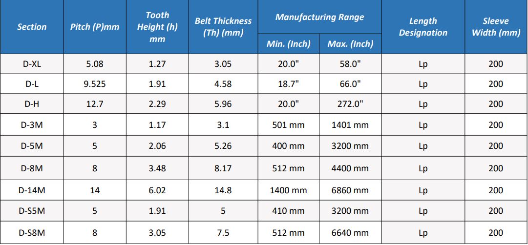 Available in a wide range of sections, including D-XL, D-L, D-H, D-3M, D-5M, D-8M, D-14M, D-S5M, and D-S8M, our Double Timing Belts can be tailored to specific industrial requirements, providing reliable performance for diverse applications.